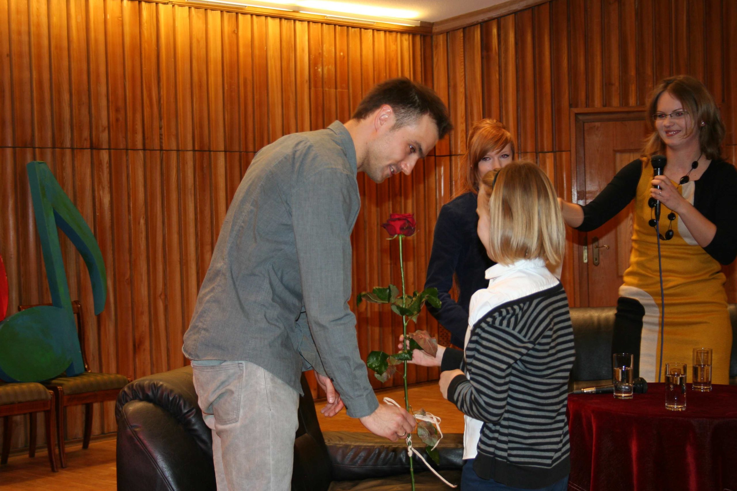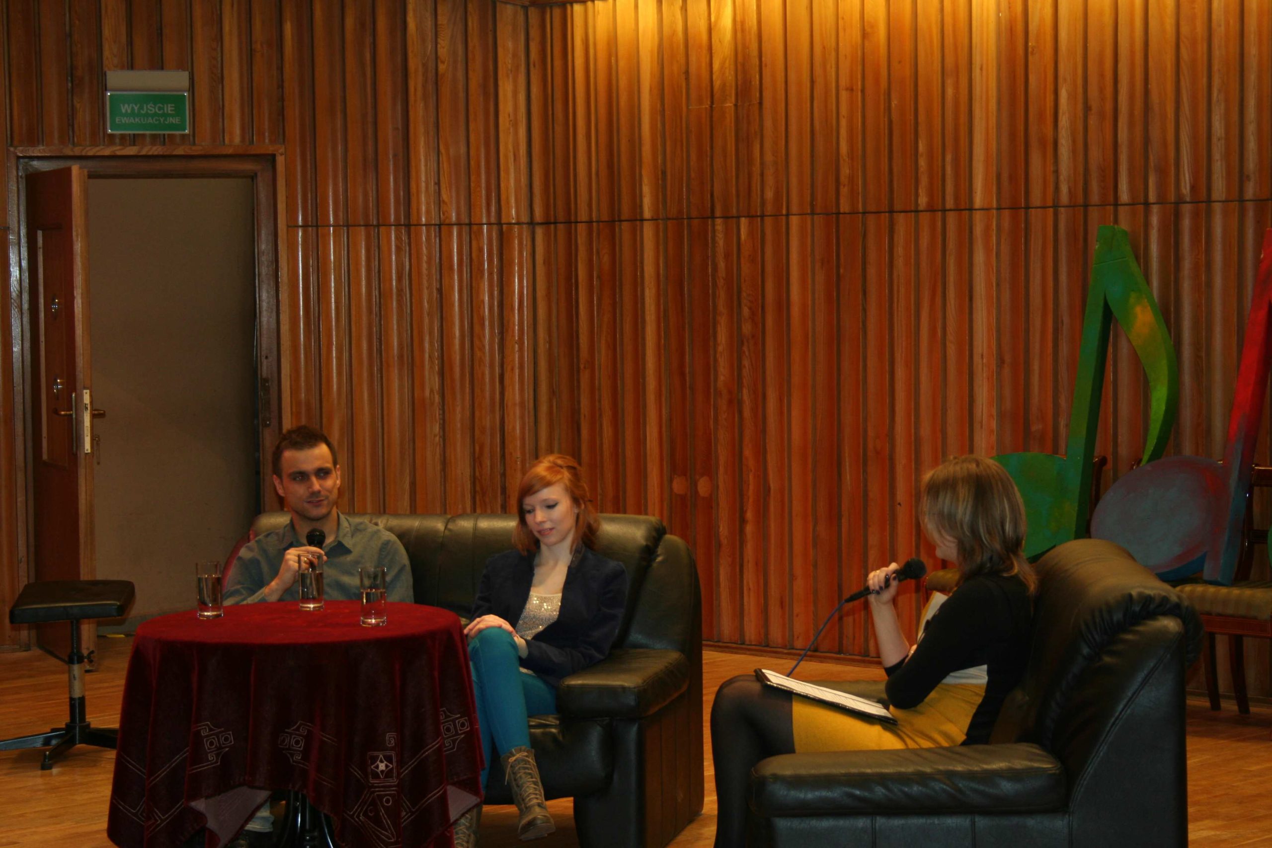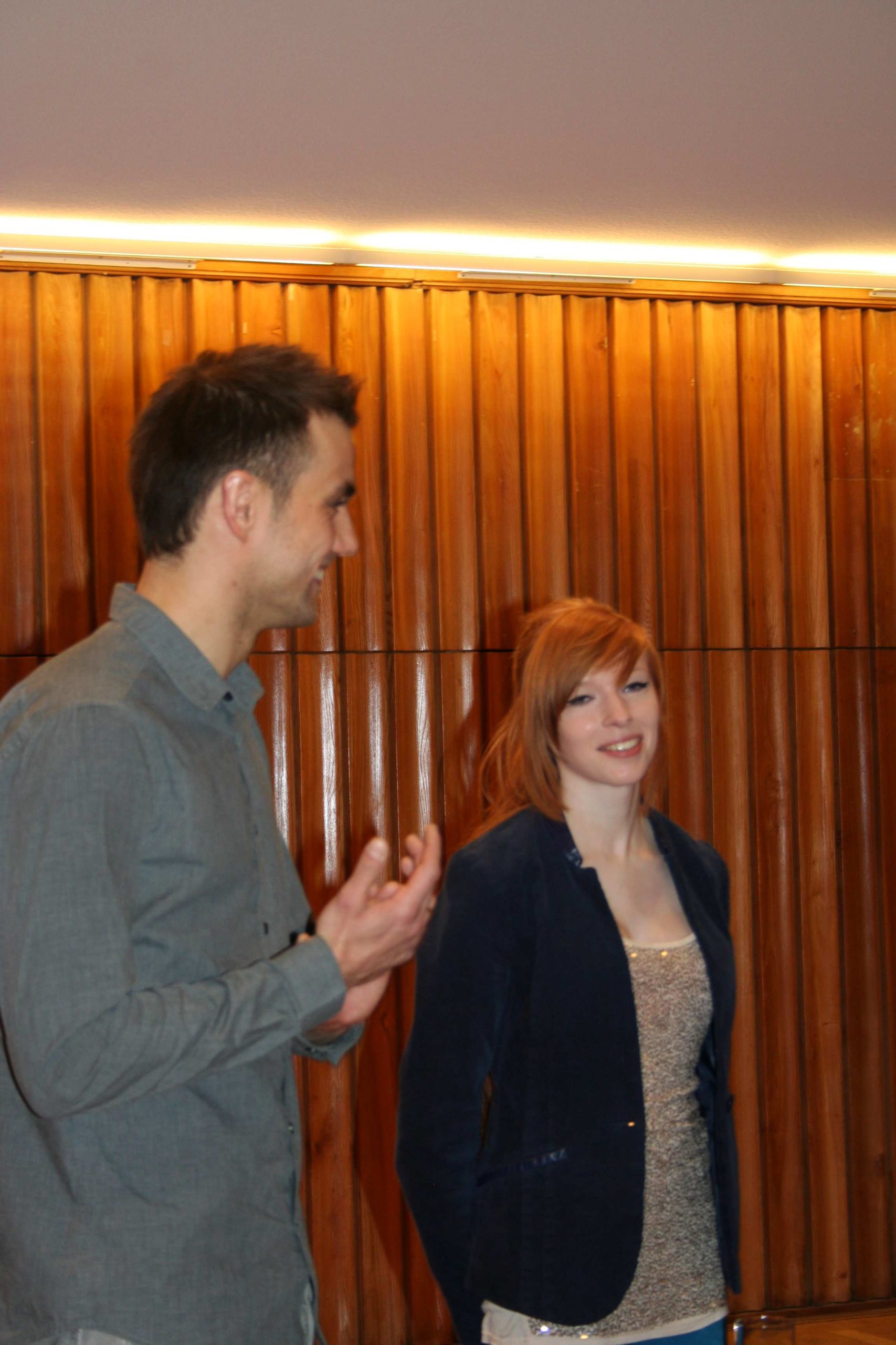 Mieliśmy okazję porozmawiać o początkach kariery, pierwszych sukcesach artystycznych ze znakomitym dyrygentem Jakubem Chrenowiczem i świetnie zapowiadającą się młodą skrzypaczką, pochodzącą z Bydgoszczy 22-letnią Mariką Przybył. Spotkanie odbyło się 22 lutego o godz. 18 w sali kameralnej Filharmonii Pomorskiej Przybyło ponad 100 naszych Klubowiczów. Goście z wielką przyjemnością opowiedzieli nam o swoich początkach z muzyką, jakie trudności napotkali na swojej drodze, o możliwościach jakie udało im się wykorzystać aby być tym kim są teraz. Każdy z Klubowiczów mógł zadać pytanie, na nurtujący go temat a artyści chętnie udzielali odpowiedzi. A oto co dowiedzieliśmy się ciekawego o naszych gościach: Marika Przybył naukę gry rozpoczęła w wieku 7 lat, wybrała skrzypce, jak sama powiedziała poszła na „łatwiznę”, gdyż mama gra na skrzypcach, tata na altówce i od dziecka miała styczność z instrumentami smyczkowymi. Ukończyła z wyróżnieniem Państwową Szkołę Muzyczną w Bydgoszczy u Krzysztofa Krymera, obecnie studiuje na Akademii Muzycznej w Gdańsku. Grę na skrzypcach doskonaliła na licznych kursach mistrzowskich m.in. u tak znakomitych artystów, jak: Wanda Wiłkomirska, Partycja Piekutowska, Grigorij Żyslin, Wiktor Pikajzen, Gorjan Košuta, Konstanty Andrzej Kulka, Bartłomiej Nizioł, Michel Willi, Marian Wasiółka, Jerzy Marchwiński czy Moscow Piano Trio i Guarneri Trio Prague. Marika ma na swym koncie laury i wyróżnienia wielu konkursów oraz przesłuchań w Polsce (m.in. Poznań, Wrocław, Warszawa, Gdańsk, Lublin) i za granicą (Słowacja, Niemcy, Rumunia). Młoda skrzypaczka za swe osiągnięcia otrzymała nagrodę Marszałka Województwa Pomorskiego, stypendia artystyczne Narodowego Banku Polskiego, Marszałka Województwa Kujawsko-Pomorskiego oraz Ministra Kultury i Dziedzictwa Narodowego, nagrodę Fundacji “Viva – Musica”, tytuł „Talent Roku 2008” przyznany przez Polski Dom Aukcyjny. Marika wiele koncertuje – wielokrotnie grała solo z towarzyszeniem orkiestry, fortepianu. Koncertuje również razem z rodzicami, którzy współtworzą kwartet Arte Con Brio. Najbliższe plany Mariki to wyjazd na Słowację w ramach wymiany międzynarodowej ERASMUS. Kariera Jakuba Chrenowicza nabiera coraz szybszego tempa, a jak nam zdradził wszystko zaczęło się od fortepianu. Nie ma w rodzinie żadnych tradycji muzycznych, nikt wcześniej nie grał na instrumencie, to zamiłowanie przyszło samo, ale jak poznał smak dyrygowania to od razu wiedział, co chce robić w życiu. Tuż po, ukończeniu z wyróżnieniem dyrygentury symfoniczno-operowej w klasie Jerzego Salwarowskiego w Akademii Muzycznej w Poznaniu, w latach 2010–2012 pierwsze szlify zawodowe zdobywał jako asystent Antoniego Wita w Filharmonii Narodowej w Warszawie. To było dla niego wielkie przeżycie i ogromne doświadczenie, jak wspominał nam to była dla niego wielka szkoła dyrygowania. Ponadto w ramach programu LLP/ERASMUS kształcił się w we Frankfurcie nad Menem. Był stypendystą Accademia Musicale Chigiana, gdzie studiował w klasie mistrzowskiej Gianluigiego Gelmettiego. Trzykrotnie otrzymał stypendium Ministra Kultury i Dziedzictwa Narodowego. Dyrygował m.in. Orkiestrą Symfoniczną Filharmonii Narodowej w Warszawie, Orkiestrą Sinfonia Varsovia, Narodową Orkiestrą Symfoniczną Polskiego Radia w Katowicach, Orkiestrą Filharmonii Poznańskiej, Orkiestrą Filharmonii Łódzkiej, Orkiestrą Opery i Filharmonii Podlaskiej czy też naszymi Symfonikami. Od początku sezonu 2012/2013 jest I dyrygentem Opery i Filharmonii Podlaskiej w Białymstoku. Czas wolny uwielbia spędzać na nartach i wędrówkach po górach. Spotkanie minęło, aż za szybko nasi rozmówcy bowiem mieli do powiedzenia jeszcze wiele interesujących rzeczy, a Klubowicz wiele pytań, ale nadszedł moment udania się na koncert do sali, który został bardzo ciepło przyjęty przez publiczność. W końcu grała nasza Bydgoszczanka 🙂