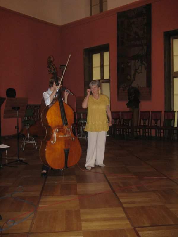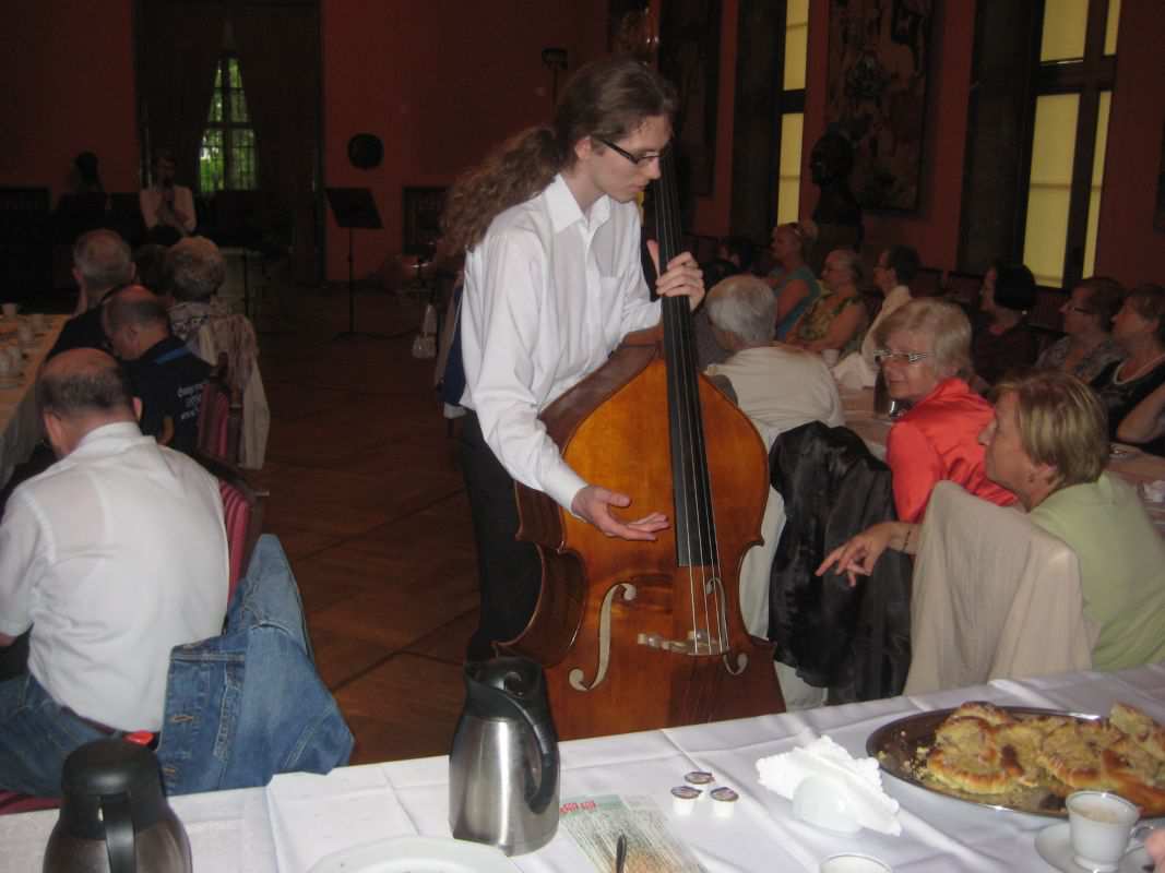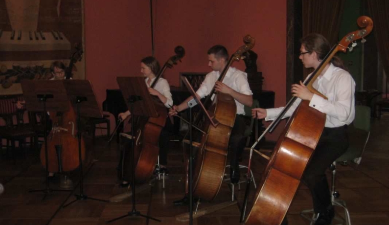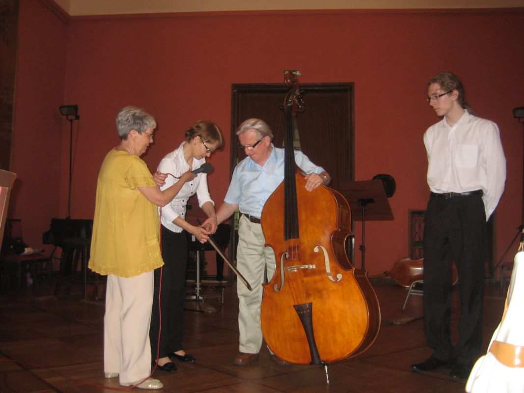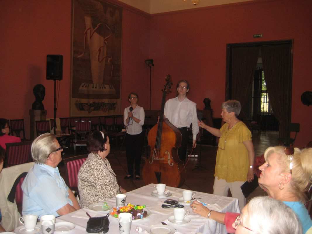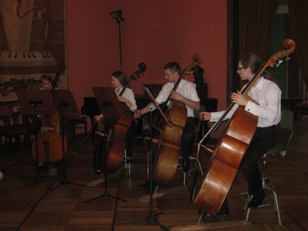 Tym razem gościliśmy Kwartet Kontrabasowy prowadzony przez dr hab. Joannę Krempeć-Kaczor. Od 11 lat pracuje w naszej Orkiestrze Symfonicznej, prowadzi również klasę kontrabasu w Akademii Muzycznej w Bydgoszczy, której jest absolwentką (klasy Piotra Kurzawy). Jest laureatką wielu konkursów muzycznych. Współpracowała ze znakomitym Kwartetem Wilanów. Występowała w wielu miastach Polski i poza granicami, prezentując muzykę solową i kameralną. Pani Joanna razem ze swoimi studentami: Mają Rumianowską, Jackiem Kujawskim i Piotrem Mocarskim przedstawiła Klubowiczom największy instrument z grupy smyczkowych jakim jest kontrabas. Padło wiele pytań dotyczących budowy, wydobywania dźwięku, roli instrumentu w orkiestrze. Ochotnicy mogli nawet spróbować zagrać na kontrabasie co sprawiło im wiele radości. Dzięki życzliwości naszych gości i ich zaangażowaniu Klubowicze uczestniczyli w kolejnym sympatycznym spotkaniu.
