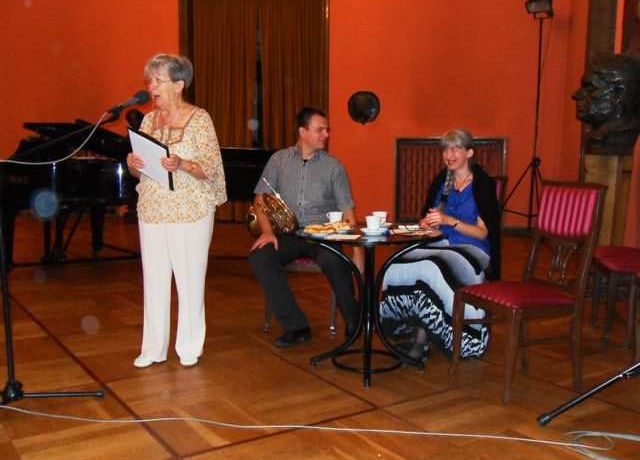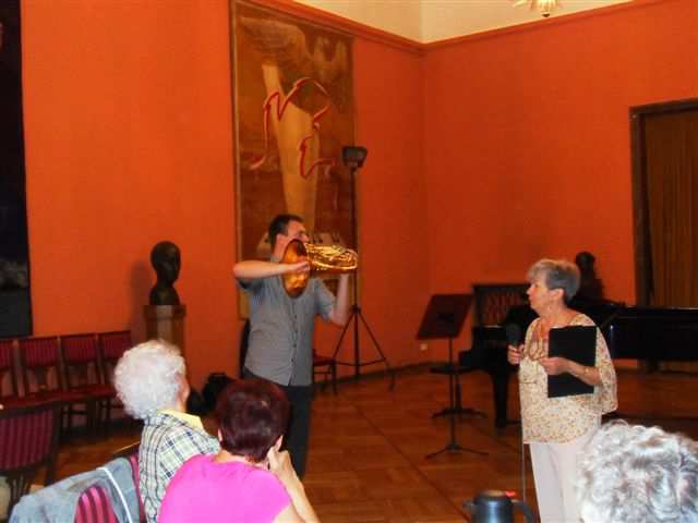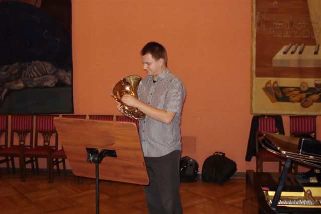 O instrumencie i nie tylko interesująco opowiedział nam Janusz Stanecki . W 2010 ukończył z wyróżnieniem Akademię Muzyczną w Bydgoszczy. Na co dzień jest pracownikiem Orkiestry Symfonicznej FP jako pierwszy waltornista oraz Opery Nova. Jest współzałożycielem i członkiem kwintetu dętego „Sonore” oraz Toruńskiego Kwintetu Waltorniowego. Współpracuje z Capellą Bydgostiensis, Toruńską Orkiestrą Symfoniczną, Polską Filharmonią Kameralną w Sopocie oraz Inowrocławską Orkiestrą Symfoniczną. W 2012 rozpoczął studia doktoranckie w Akademii Muzycznej w Bydgoszczy. Pochodzi z umuzykalnionej rodziny – ojciec Janusz Stanecki jest chórmistrzem, dyrygentem, profesorem sztuk muzycznych Akademii Muzycznej w Bydgoszczy, siostra znakomitą wiolonczelistką. Do największych zainteresowań zalicza miłość do rodziny i instrumentu, interesuje się również historią, militariami i turystyką. Oprócz suchych faktów na temat budowy instrumentu, jego historii Janusz Stanecki zaprezentował nam kilka najciekawszych fragmentów muzycznych a akompaniowała mu Maria Kukier-Turkiewicz, pianistka Orkiestry Symfonicznej Filharmonii Pomorskiej. Pochodzi z Torunia, tam się urodziła i ukończyła szkołę muzyczną. Kształciła się u dwóch znakomitych pedagogów – Wiesławy Ronowskiej i Jerzego Sulikowskiego. Współpracowała z Filharmonią Bałtycką. Już od 29 lat pracuje w FP jako muzyk solista – pianista. Gra również na organach, klawesynie, celeście. Pracuje w Akademii Muzycznej na stanowisku starszego wykładowcy. Akompaniuje skrzypkom, flecistom, fagocistom. Mąż – chemik, córka uczy się w Liceum Plastycznym, gra na harfie. Najlepiej czuje się w górach, uwielbia turystykę górską i pieszą. Jest bardzo wrażliwą i ciepłą osobą. Spotkanie Klubu upłynęło nam niezwykle szybko, dzięki naszym gościom dowiedzieliśmy się niezwykle ciekawych i interesujących rzeczy na temat instrumentu, jak również życia muzyka w orkiestrze. Klubowicze zostali także powiadomieni o koncertach tegorocznego 51. Bydgoskiego Festiwalu Muzycznego oraz o najbliższych wydarzeniach nowego sezonu artystycznego 2013/14.