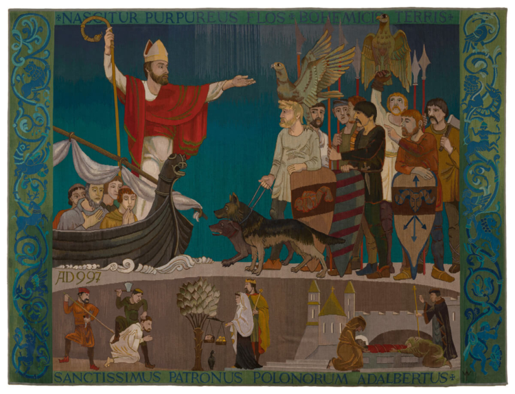 W górnej partii tapiserii wzdłuż górnej krawędzi tkaniny łaciński napis wersalikami: NASCITUR PURPUREUS FLOS BOHEMICIS TERRIS ze stylizowanymi krzyżami greckimi – dwa flankują napis z obu stron (na początku i na końcu), trzeci rozdziela napis w środku na dwie części. W dolnej partii tapiserii wzdłuż dolnej krawędzi tkaniny łaciński napis wersalikami: SANCTISSIMUS PATRONUS POLONORUM ADALBERTUS zakończony stylizowanym krzyżem greckim na końcu.