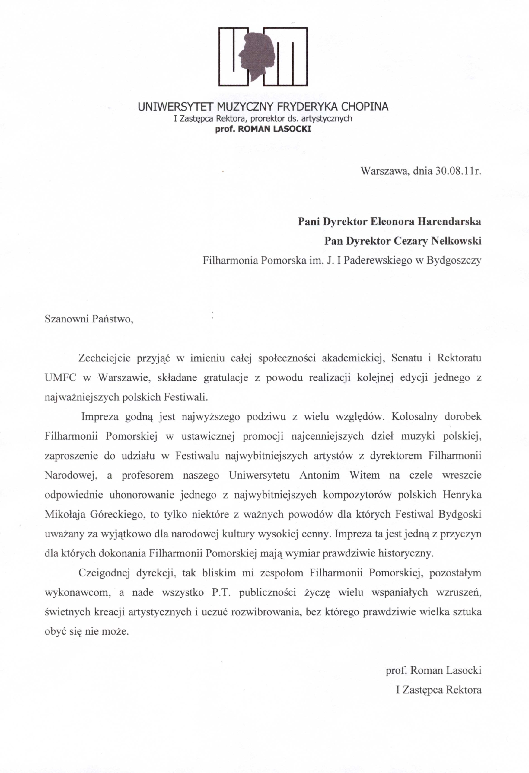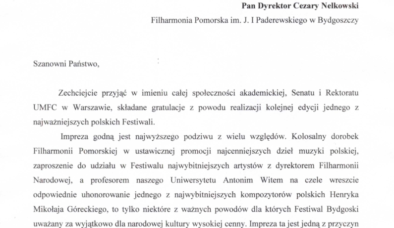 Gratulacje od Uniwersytetu Muzycznego Fryderyka Chopina w Warszawie