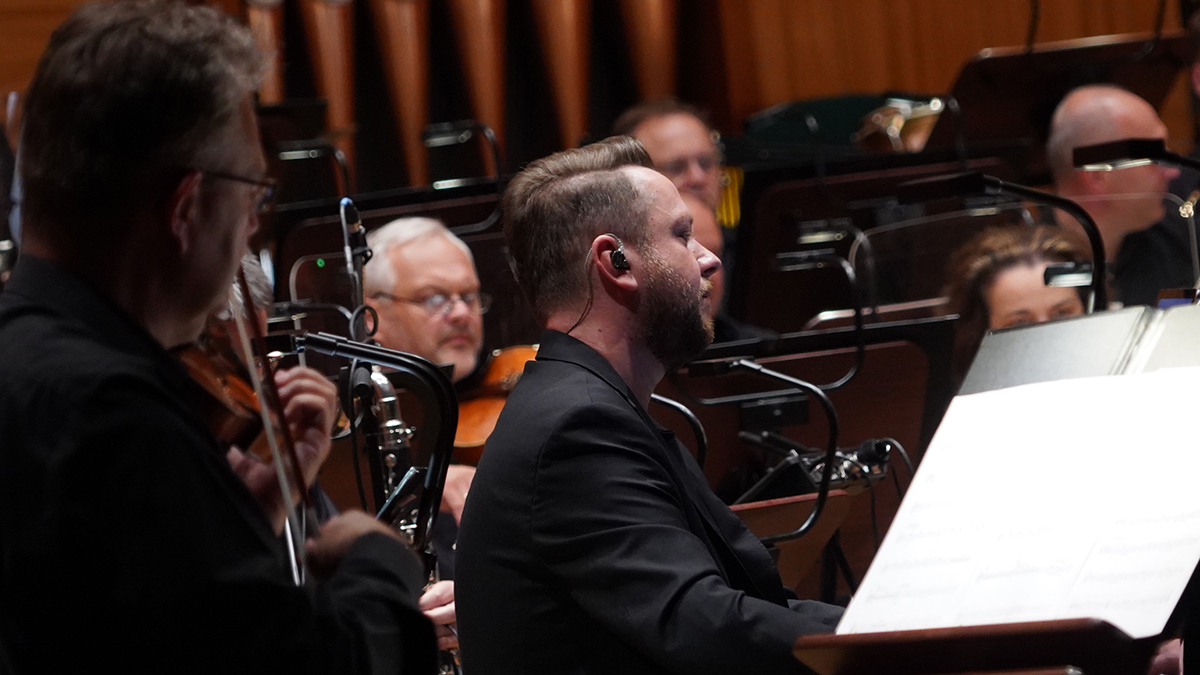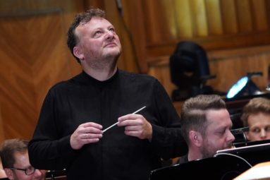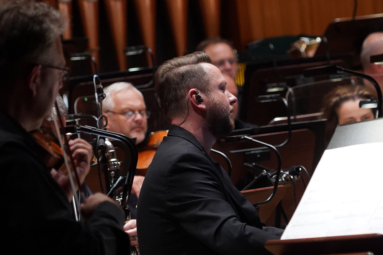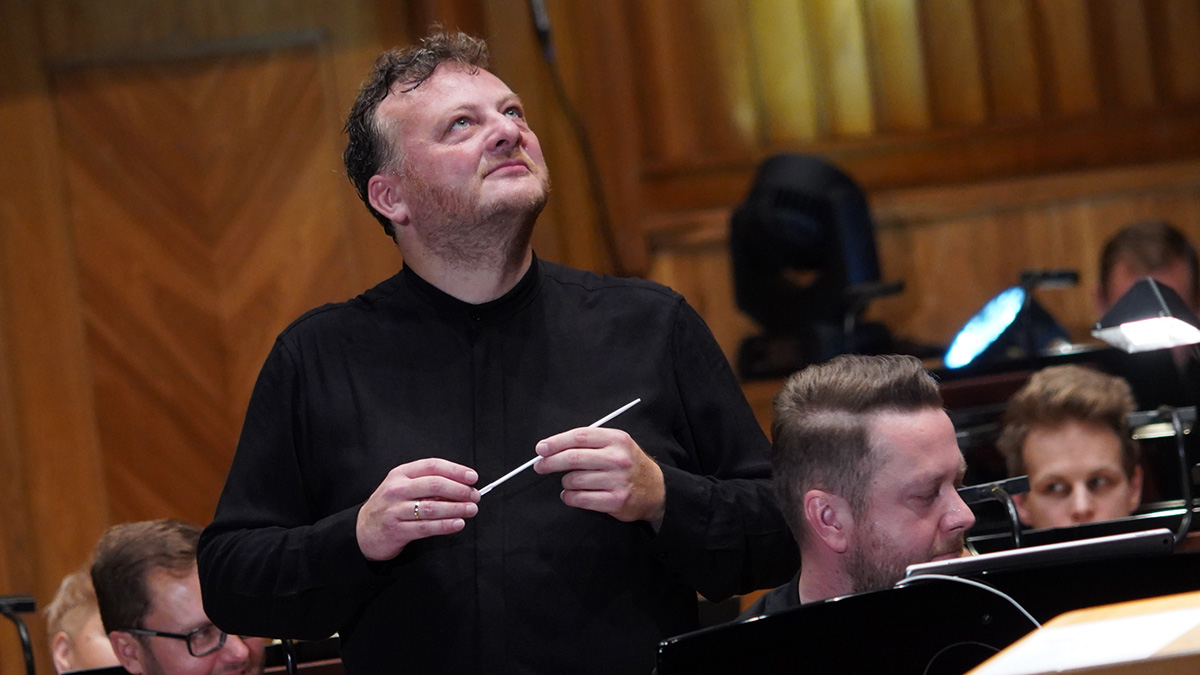 Za pulpitem dyrygenckim – Adam Klocek (wiolonczelista, dyrygent, kompozytor i pedagog; w latach 2006–2020 dyrektor Filharmonii Kaliskiej, od 2020 dyrektor Filharmonii Częstochowskiej).