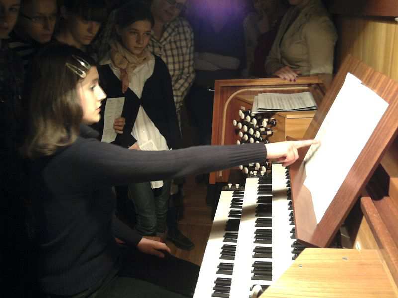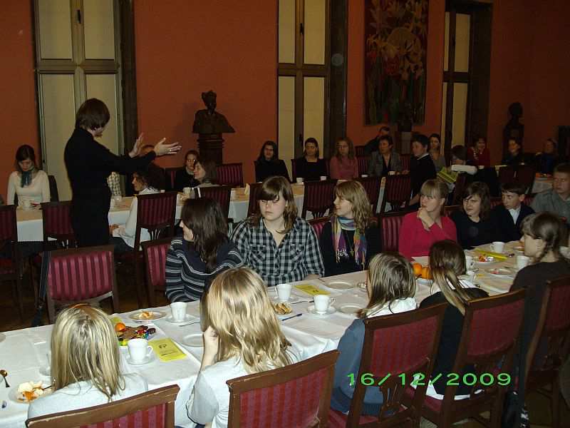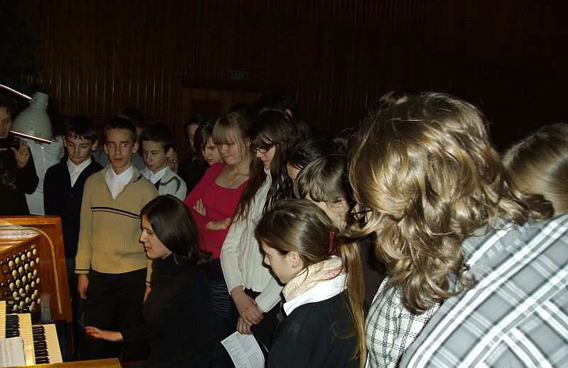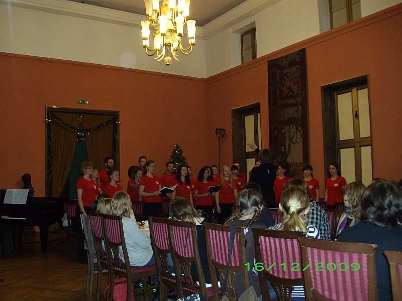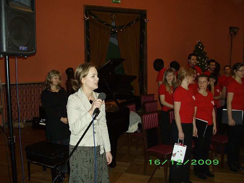 A to z przyczyny naszych przemiłych gości – rozśpiewanej braci studenckiej z Uniwersytetu Techniczno-Przyrodniczego w Bydgoszczy. Chór zaśpiewał bowiem najpiękniejsze polskie kolędy i pastorałki i od razu zapachniało choinką, świeżo upieczonymi piernikami, po prostu Świętami Bożego Narodzenia. Spotkanie rozpoczęła, atrakcyjna, jak się okazało dla Klubowiczów, prezentacja organów, jakie znajdują się na dużej sali koncertowej Filharmonii Pomorskiej im. Artura Rubinsteina. Była to niebywała okazja do usłyszenia tego instrumentu, który nieczęsto brzmi podczas koncertów w roli instrumentu solowego. Prezentację poprowadziła Sylwia Nowicka członkini naszego Klubu od lipca, magister sztuki, absolwentka studium organistowskiego w Gnieźnie, która podzieliła się z nami swoimi umiejętnościami gry na organach. Organy, które zobaczyliśmy zostały zbudowane przez czeską firmę Rieger-Kloss w 1977, ten bydgoski instrument jest bardzo podobny do organów znajdujących się w sali koncertowej Konserwatorium moskiewskiego. Trzymodułowe organy wyposażone w 48 głosów inaugurowano recitalem w wykonaniu Mirosława Pietkiewicza na początku sezonu artystycznego 1977-1978. Artysta ten w Bachowskim repertuarze zaprezentował brzmienie i możliwości techniczne tego instrumentu. Eksperci uznali, że czeski instrument w pełni odpowiada wymogom koncertowym, posiada szerokie możliwości brzmieniowe dostosowane do wykonywania repertuaru organowego różnych epok i stylów muzycznych. Po wysłuchaniu prezentacji wszyscy udaliśmy się do foyer, gdzie czekali na nas kolejni goście; Chór Akademicki Uniwersytetu Technologiczno-Przyrodniczego, który jest najmłodszym zespołem z bydgoskich uczelni. Chór powstał i pracuje pod kierunkiem Agnieszki Sowy od października 2007, choć tradycja chóralna uczelni sięga lat 70. Skupia w swym gronie studentów, absolwentów UTP jak i innych uczelni bydgoskich. Wszystkich łączy pasja twórczej działalności i pełne poświęcenia umiłowanie muzyki. Dotychczas zespół wystąpił ponad trzydzieści razy, uświetniając ważne uroczystości uczelni jak i miasta. Do ważnych należą koncerty w ramach Tygodnia Kultury Chrześcijańskiej, koncerty kolęd i pastorałek w kościele filialnym pw. św. Marii Magdaleny we Włókach dla Stowarzyszenia Przyjaciół Dorzecza Dolnej Wisły. W czerwcu br. Chór zadebiutował podczas Międzynarodowego Konkursu „Svatky pisni” w Ołomuńcu, zdobywając Złoty Dyplom i Złoty Medal. Pani Agnieszka Sowa jest absolwentką Akademii Muzycznej w Bydgoszczy. Laureatka trzeciej nagrody w konkursie ogólnopolskim dyrygentów chóralnych w Poznaniu. Swoje zawodowe plany związała z Bydgoszczą, gdzie podjęła pracę w Zespole Szkół Muzycznych im. Artura Rubinsteina. W tejże szkole założyła i prowadzi chór dziecięcy Rubinki, który odnosi liczne sukcesy w konkursach i na festiwalach chóralnych. Jako dyrygent i pedagog wokalny prowadzi również na wydziale wokalnym żeński zespół wokalny. W swojej pracy dużo uwagi poświęca zagadnieniom z zakresu emisji głosu i pracy nad głosem. Bierze czynny udział w konkursach oraz sympozjach metodycznych.. Jako uzupełnienie swej pasji śpiewem – Pani Agnieszka podjęła również pracę w Teatrze Polskim w Bydgoszczy jako korepetytor muzyczno-wokalny, otaczając profesjonalną opieką zespół artystyczny tegoż teatru, prowadząc zajęcia z zakresu emisji głosy. Pani Agnieszka Sowa przeprowadziła pokazową i wzorcową próbę Chóru oraz swego rodzaju warsztaty wokalne, które uświadomiły Klubowiczom, jak trudna, wyboista i długa jest droga do profesji śpiewaka solowego, ale jednocześnie wspaniała, pełna przygód, sukcesów i osobistych satysfakcji. Zaprezentowała ćwiczenia emisyjne, w których wspólnie uczestniczyliśmy. Spotkania zamknęło wspólne kolędowanie, przy którym akompaniowała pani Marzena Buchwald, absolwentka Akademii Muzycznej w Bydgoszczy w klasie fortepianu prof. Wiesławy Ronowskiej, Akademii Muzycznej w Krakowie w klasie klawesynu prof. Bogumiły Gizbert-Studnickiej. Ukończyła również Studia Podyplomowe w Akademii Muzycznej w Warszawie w zakresie kameralistyki fortepianowej w klasie prof. Barbary Halskiej. Uczestniczka międzynarodowych kursów interpretacji muzyki kameralnej, fortepianowej i klawesynowej w Polsce, Niemczech, Francji, Holandii, Wielkiej Brytanii. Jako klawesynistka brała udział w międzynarodowych konkursach w Lipsku, Brugge i Paryżu. Została stypendystką wielu instytucji kulturalnych takich jak: belgijskiej fundacji Musica, Festivalu van Vlaanderen Brugge, Académie Musicale de Villecroze, Conservatorium van Amsterdam, Dartinghton International Summer School of Music, Ministerstwa Kultury i Sztuki.