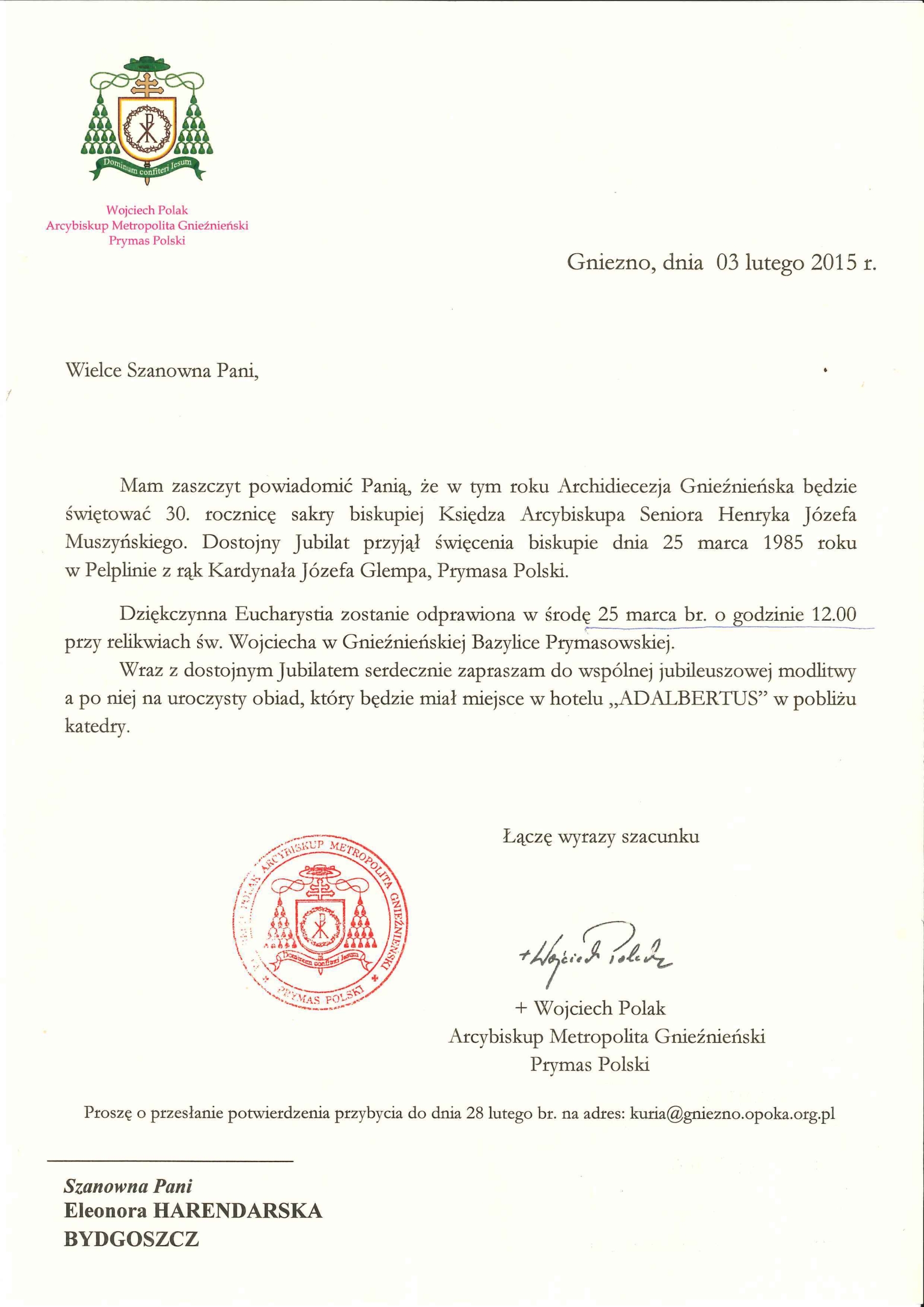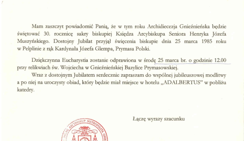 Zaproszenie na 30. rocznicę Sakry Biskupiej księdza arcybiskupa seniora H.J. Muszyńskiego